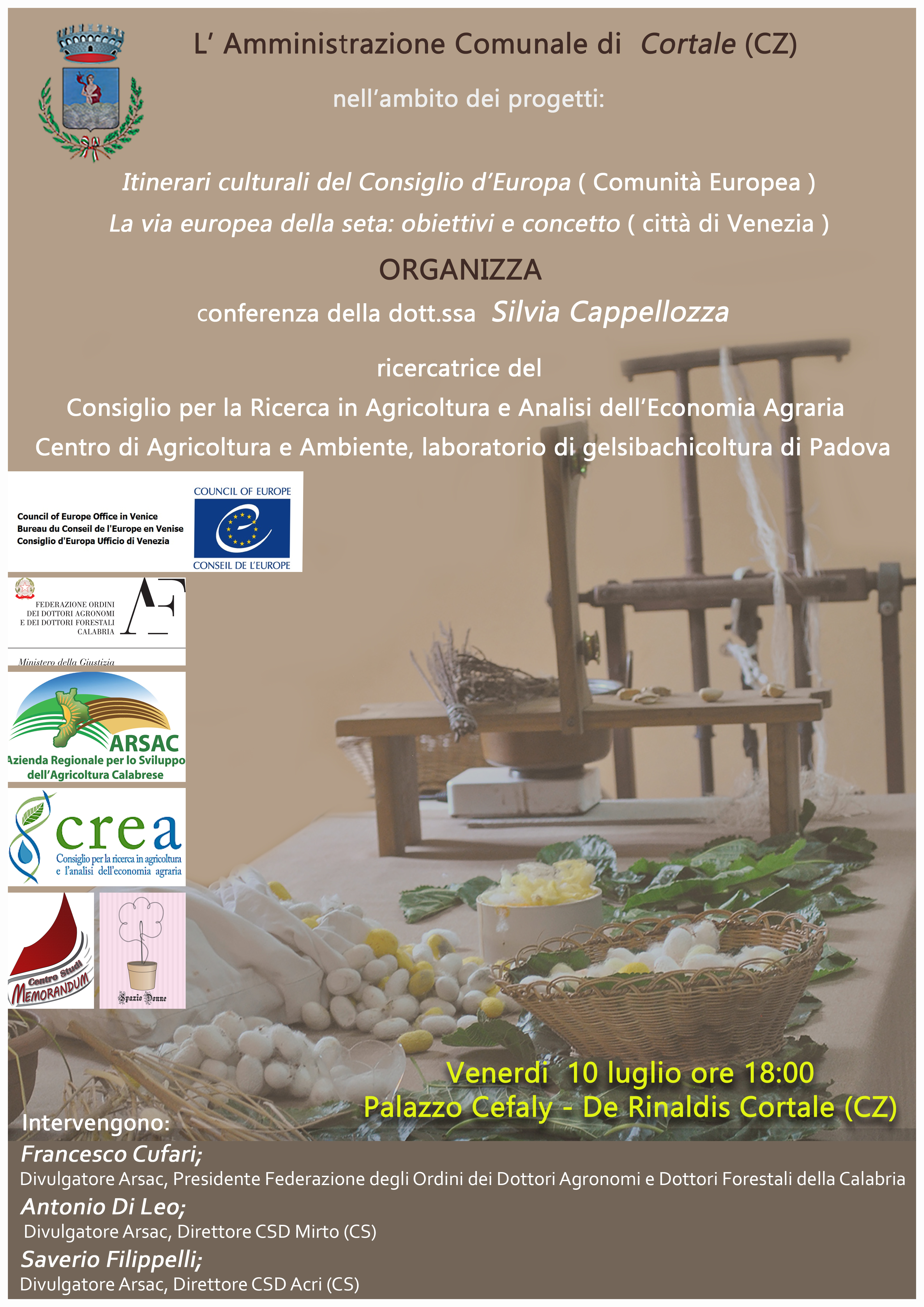 Il 10 luglio, Silvia Cappellozza, ricercatrice del CREA Agricoltura e Ambiente, terrà la conferenza sulla Gelsibachicoltura in Calabria, organizzata a Cortale (CZ), nell'ambito dei progetti "Itinerari culturali del Consiglio d'Europa" e "La via europea della Seta".