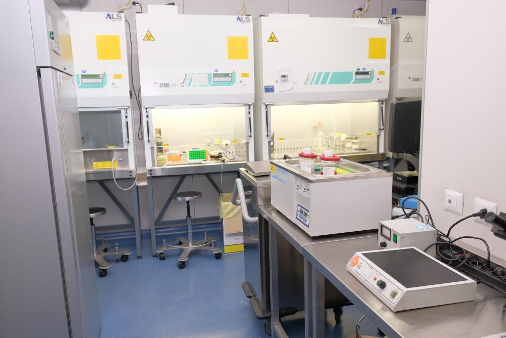 Il laboratorio è dotato di apparecchiature per la decontaminazione ambientale e di un Pass Box con sistema di disinfezione a raggi UV per il trasferimento di materiali tra zona anticamera e zona manipolazione. Nei laboratori BSL2 e BSL3 sono in dotazione cappe di biosicurezza a flusso laminare per la manipolazione degli agenti biologici e la protezione del personale in caso di produzione di aerosol durante il lavoro (Normativa ISO 14644).